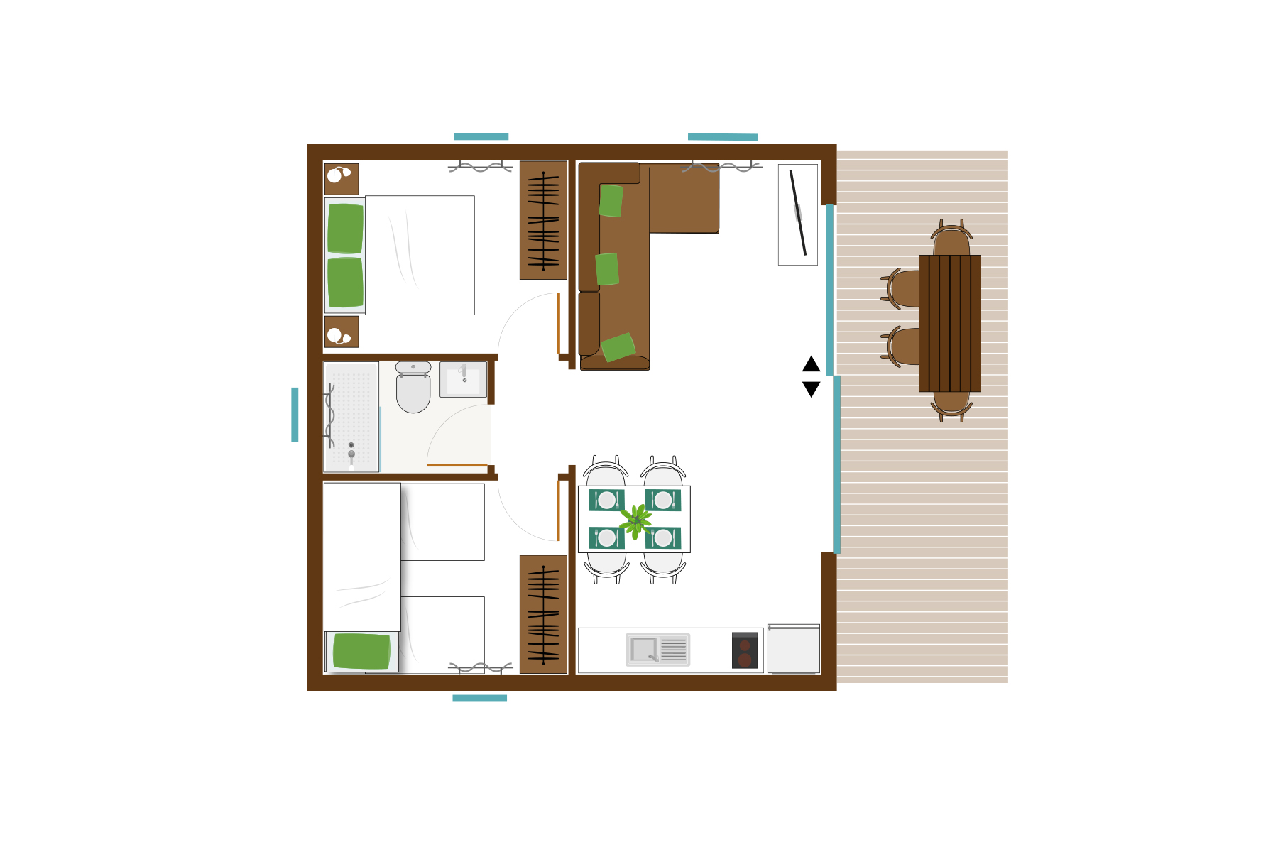 Bungalows molt amplis i confortables, distribuïts en planta baixa amb 2 habitacions, una doble i una triple, bany complet i àmplia zona de cuina americana i ampli menjador. Ideal per famílies nombroses.