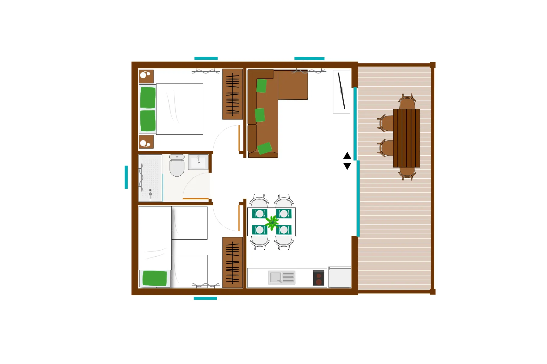De nieuwe Premium Family bungalows van massief hout voor 5 personen, zijn gelegen vlakbij het zwembad. Ideaal voor gezinnen zodat de ouders zich geen zorgen hoeven te maken wanneer de kinderen buiten spelen. Grote buiten veranda. Beddengoed is aanwezig.